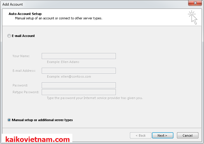 Bước 3: Check chọn: Manually configure server settings or additional server type, nhấn Next