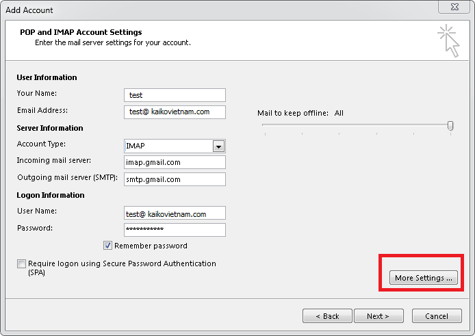 Lưu ý : Nếu bạn sử dụng IMAP thì bạn điền phần incoming mail server và outgoing mail server như hình bên dưới.